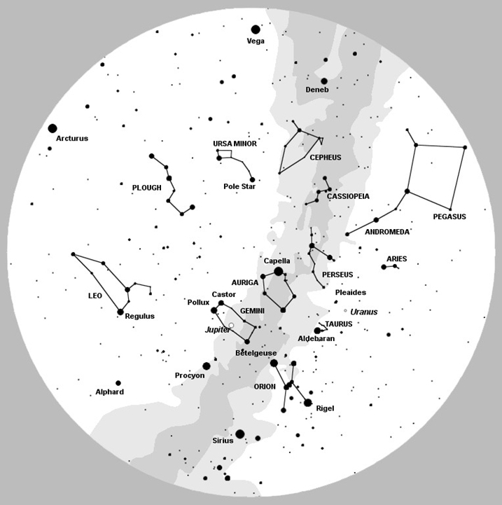 The Square of Pegasus and the stars of Andromeda are now low in the south-west, with the ‘W’ of Cassiopeia just above. High overhead are the stars of Perseus and Auriga, along with the constellation of Gemini and its Twin stars Castor and Pollux, this year joined by the brilliant planet Jupiter. Below Gemini is the bright star Procyon, often known as the ‘Little Dog Star’.