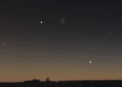 The narrow crescent Moon beside Mercury and Saturn – view looking west-south-west at 1845 UT on Thursday 19th February.
