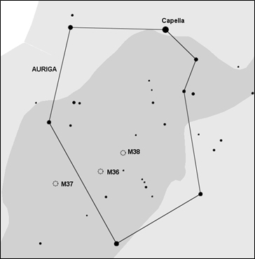 The region of the winter Milky Way that runs through the constellation of Auriga is rich in star clusters. The brightest of these have ‘Messier’ or ‘M’ classifications, from their listing in the famous catalogue by the 18th century French astronomer Charles Messier. The chart on the left shows the location of three bright Messier clusters in Auriga, M36, M37 and M38, all of which are easily seen in binoculars.